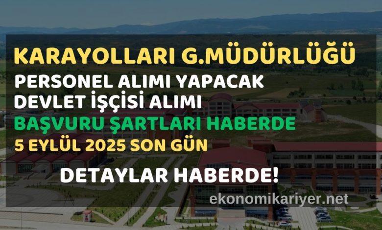 Karayolları Genel Müdürlüğü bünyesinde yapılacak işçi alımlarında başvurular 5 Eylül 2025 tarihinde sona erecek.