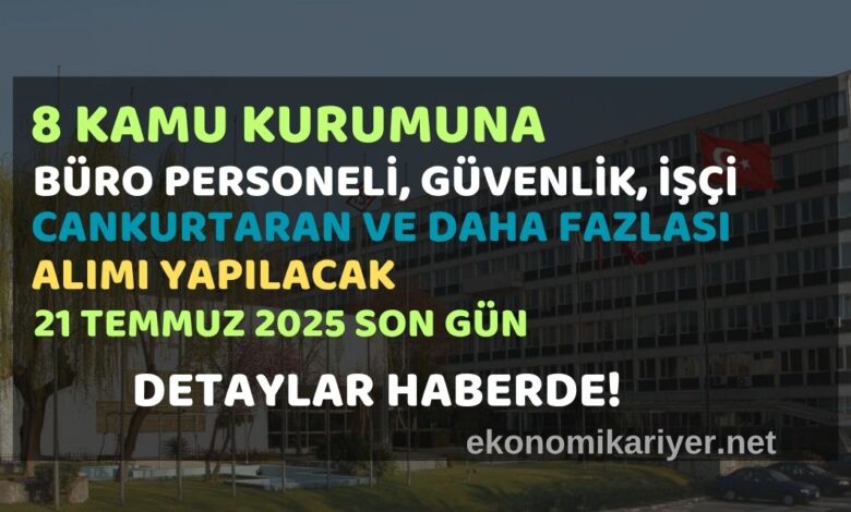Türkiye genelinde kamu sektöründe çalışmak isteyen binlerce vatandaş için sevindiren bir gelişme yaşandı. 8 farklı kamu kurumu, çeşitli branşlarda personel alımı yapacağını duyurdu. Yapılacak alımlar kapsamında büro personeli, silahsız özel güvenlik görevlisi, halkla ilişkiler elemanı, cankurtaran ve beden işçisi gibi kadrolarda çok sayıda kişi istihdam edilecek.