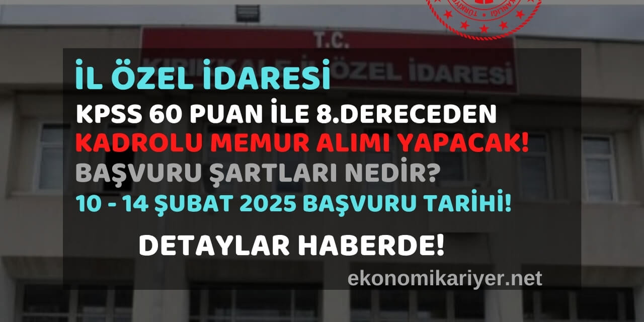 Kırklareli İl Özel İdaresi, 2025 yılında devlet memuru kadrolarına atama yapmak üzere resmi bir duyuru yayımladı. Duyuruya göre, KPSS (Kamu Personeli Seçme Sınavı) puanı ile çeşitli kadrolarda personel alımı yapılacak.