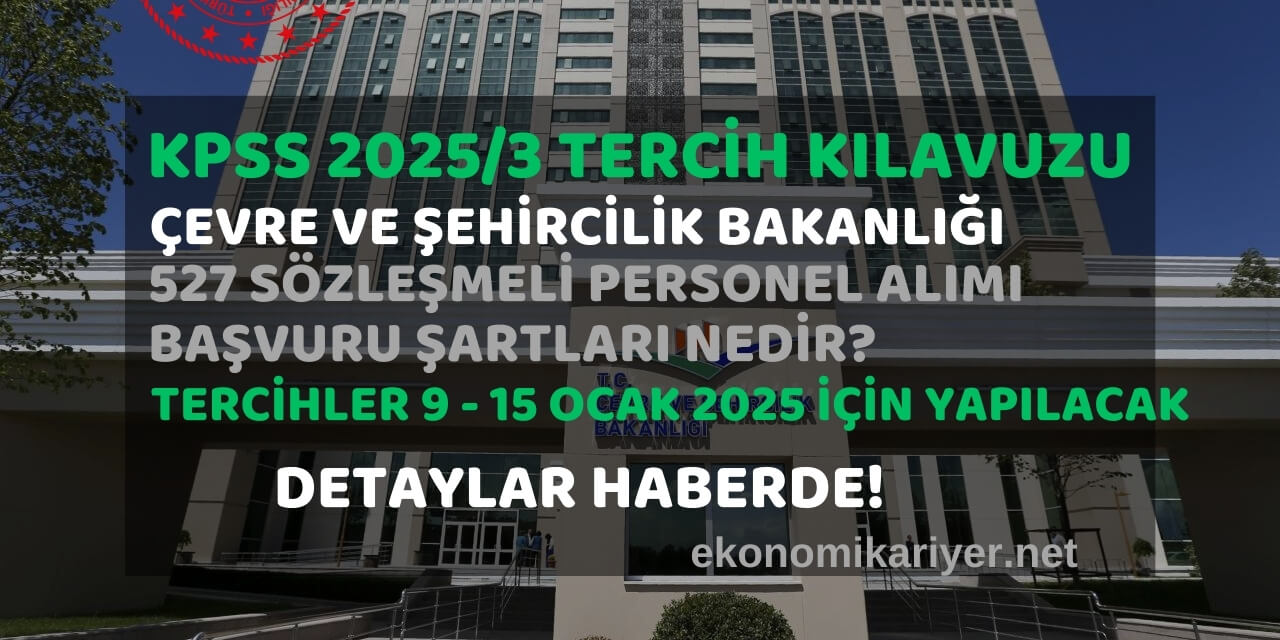 Ölçme, Seçme ve Yerleştirme Merkezi (ÖSYM), 2025 yılı için KPSS 2025/3 Tercih Kılavuzu’nu yayımlayarak, Çevre, Şehircilik ve İklim Değişikliği Bakanlığı’na bağlı farklı departmanlarda çalışacak 527 sözleşmeli personel alımı için başvuruları almaya başladı.