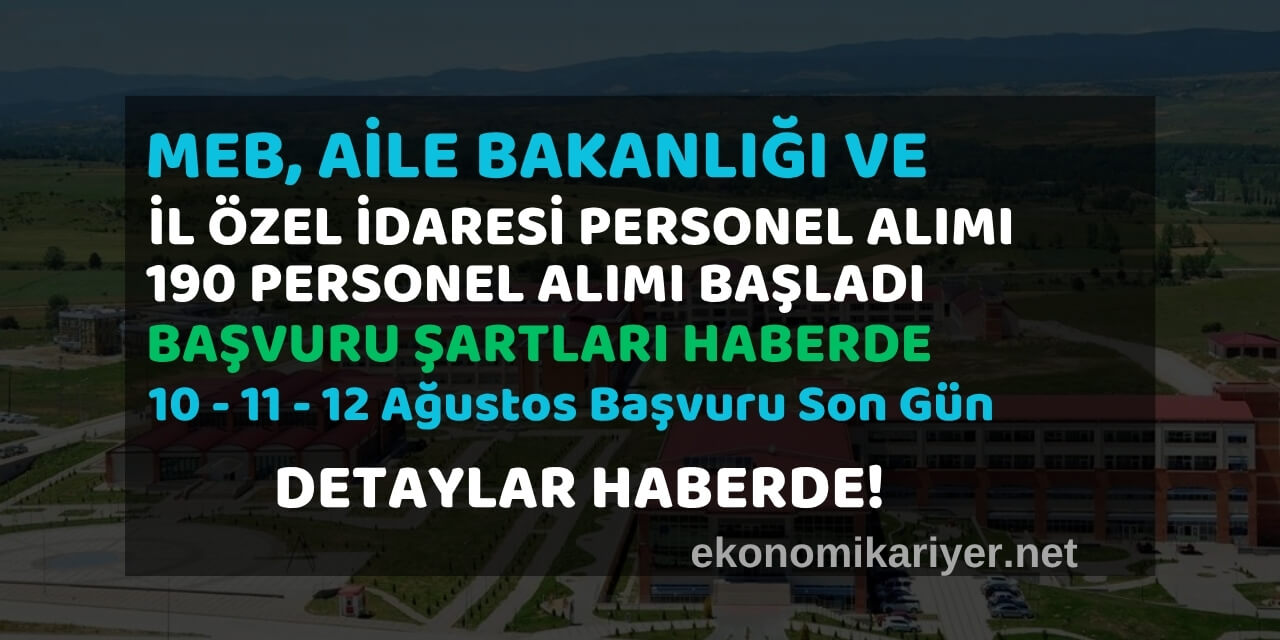 Milli Eğitim Bakanlığı (MEB), Aile ve Sosyal Hizmetler Bakanlığı ile İl Özel İdareleri bünyesinde çalışmak üzere toplam 190 personel alımı yapılacak. Türkiye İş Kurumu (İŞKUR) üzerinden yayımlanan ilana göre, farklı illerde ve kurumlarda görevlendirilmek üzere başvurular başladı. İşte il il kontenjan listesi, başvuru şartları, tarihler ve tüm detaylar…