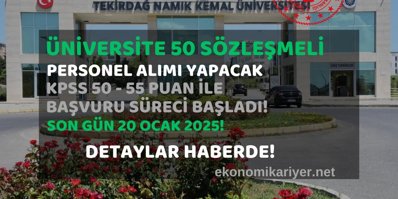 Devlet Memurları Kanunu’nun 657 sayılı Kanun’un 4/B maddesi uyarınca Tekirdağ Namık Kemal Üniversitesi, KPSS (B grubu) puan sırasına göre toplamda 50 personel alımı yapacak.